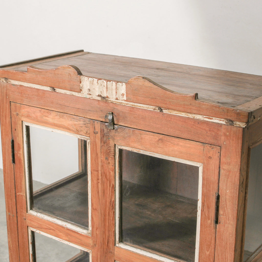 Infused with warmth and tradition, this compact vintage Indian glass almirah is crafted from solid teak and finished with a natural wax that highlights its aged grain. With glass-panelled doors and original fittings, it offers 60–80 years of Rajasthani heritage in a versatile scale. Perfect for use as a bedside cabinet, hallway storage, or display for books and ceramics, it blends practicality with cultural story.