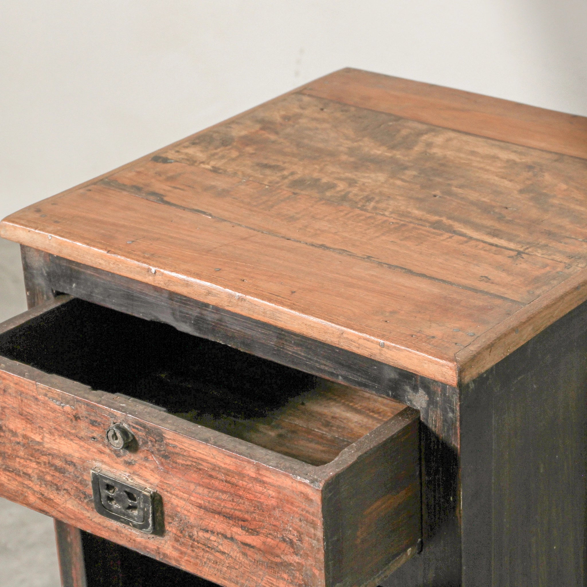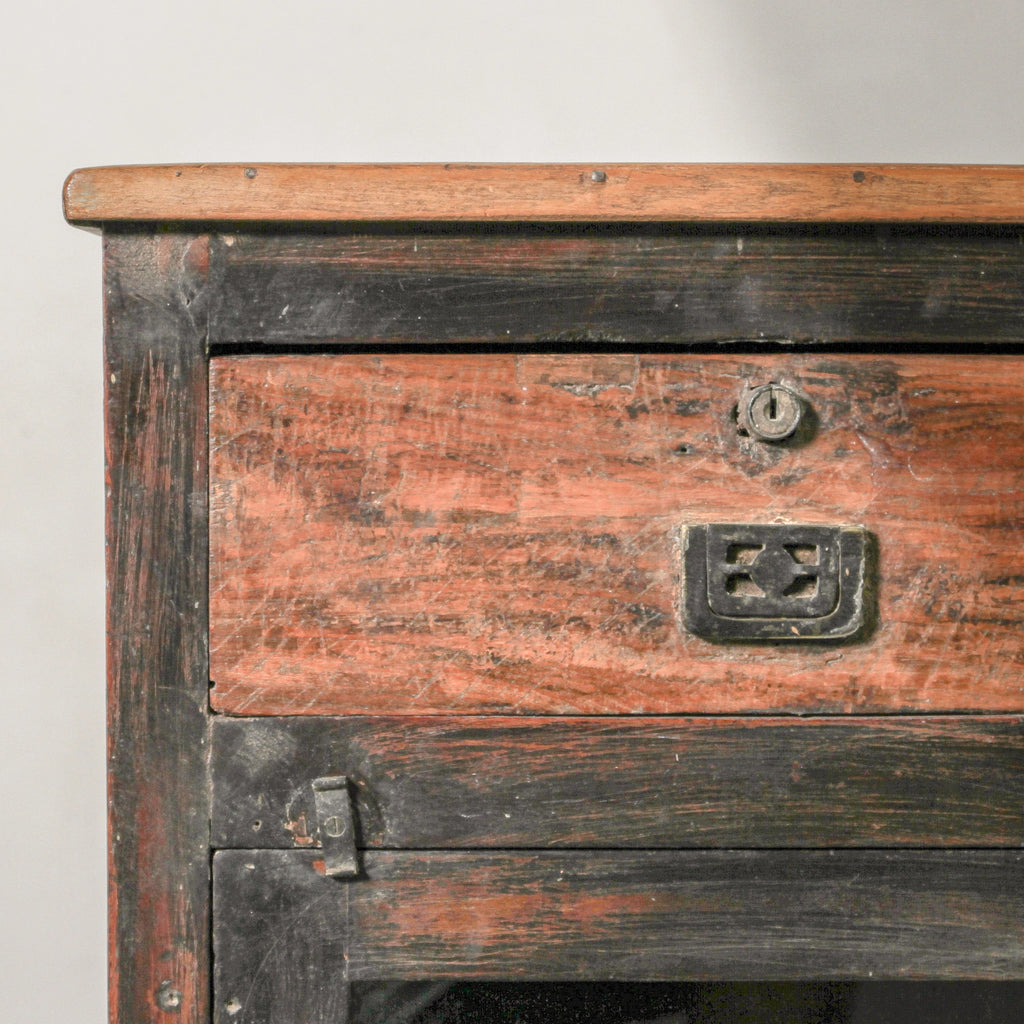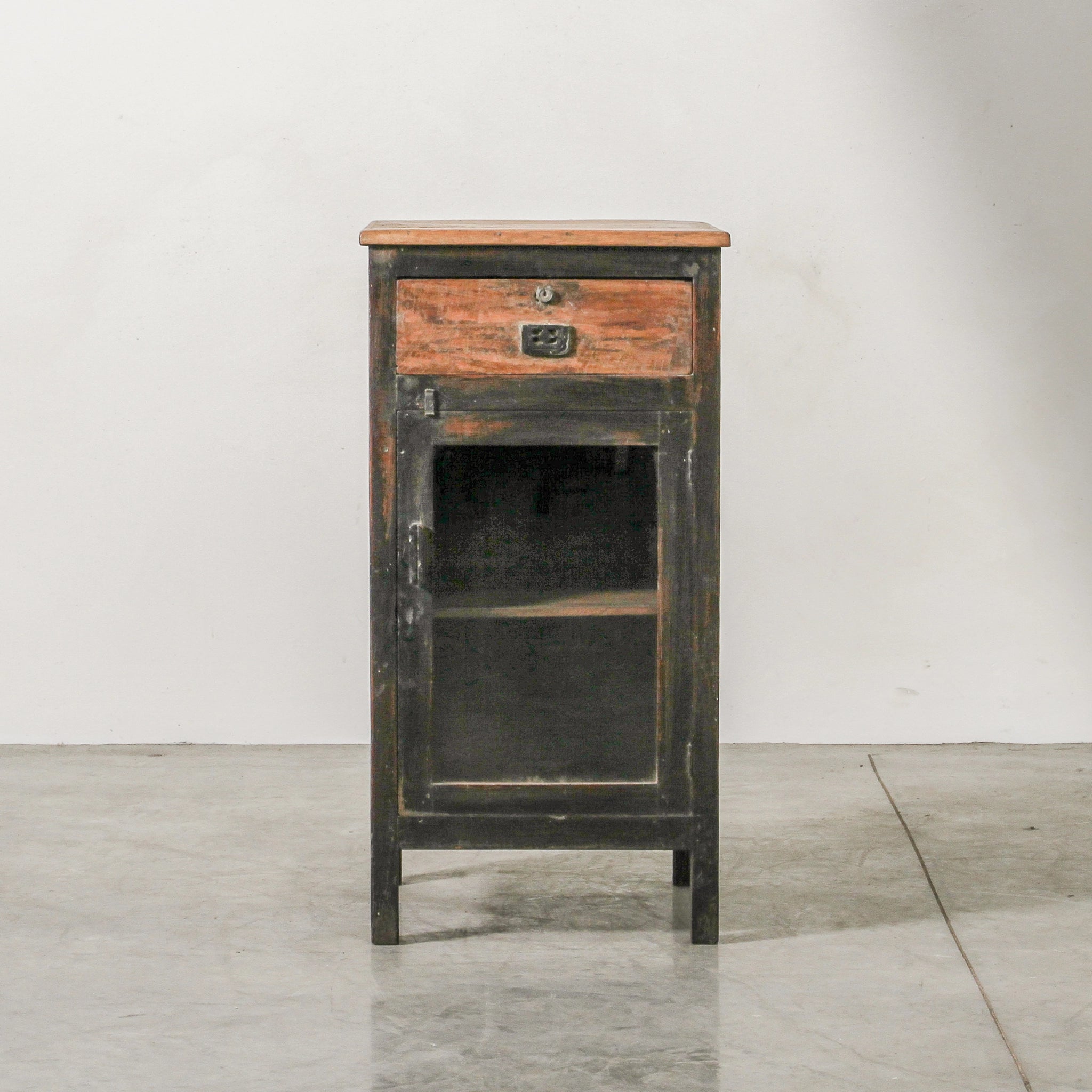Infused with warmth and tradition, this vintage Indian almirah is crafted from solid teak with a wax finish that enhances its aged surface. Featuring a glass-fronted door and a practical drawer, it carries 60–80 years of Rajasthani heritage while offering compact, functional storage. Perfect as a bedside companion or accent cabinet, it blends everyday utility with cultural character.
