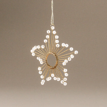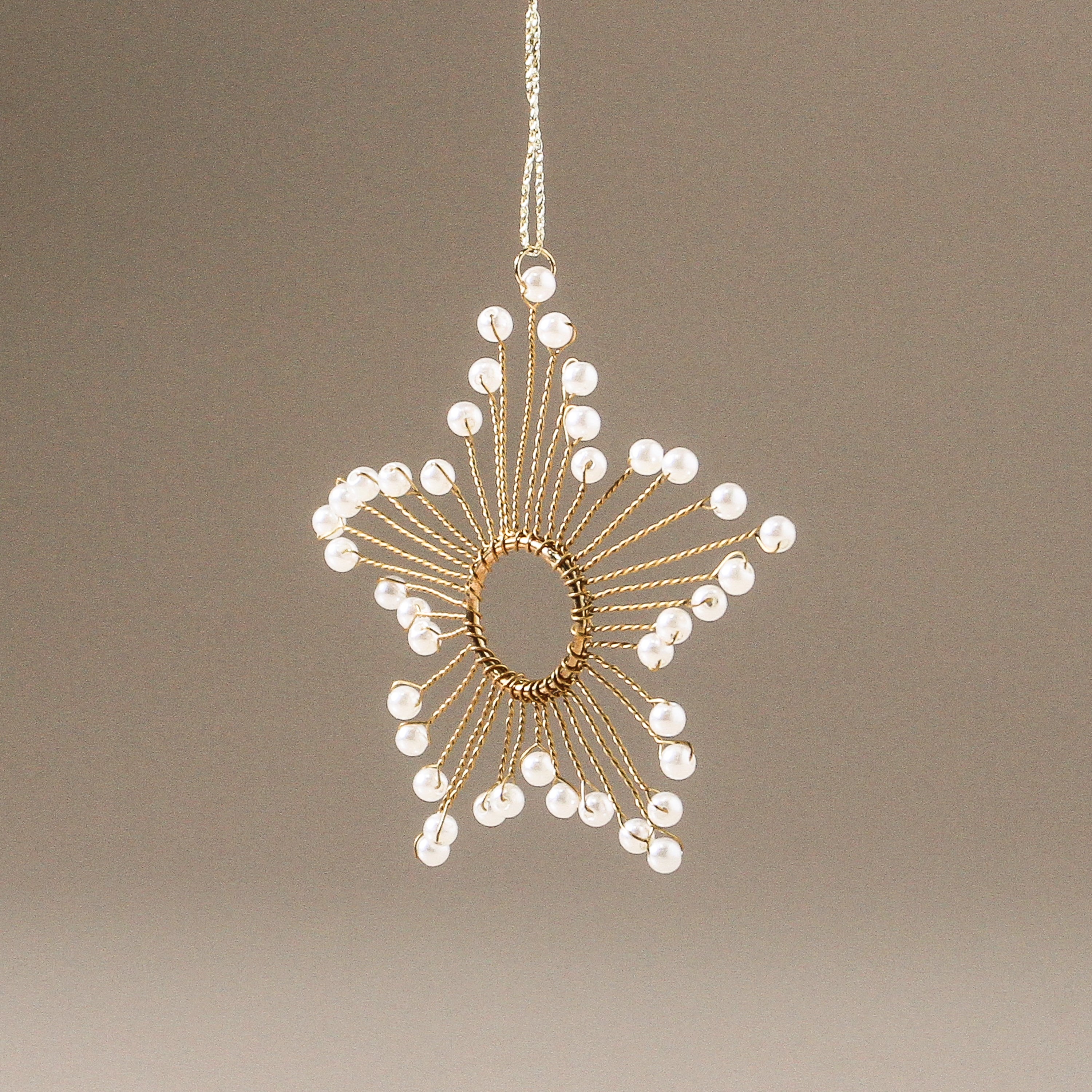 Radiant and celestial, the Celeste Beaded Decoration is shaped like a starburst — its fine golden spokes tipped with glistening pearl details. It evokes the stillness of starlight and the craftsmanship of vintage adornments. Light as air and made by hand, it feels more like a keepsake than a decoration — something that whispers of celebrations long past and those still to come.