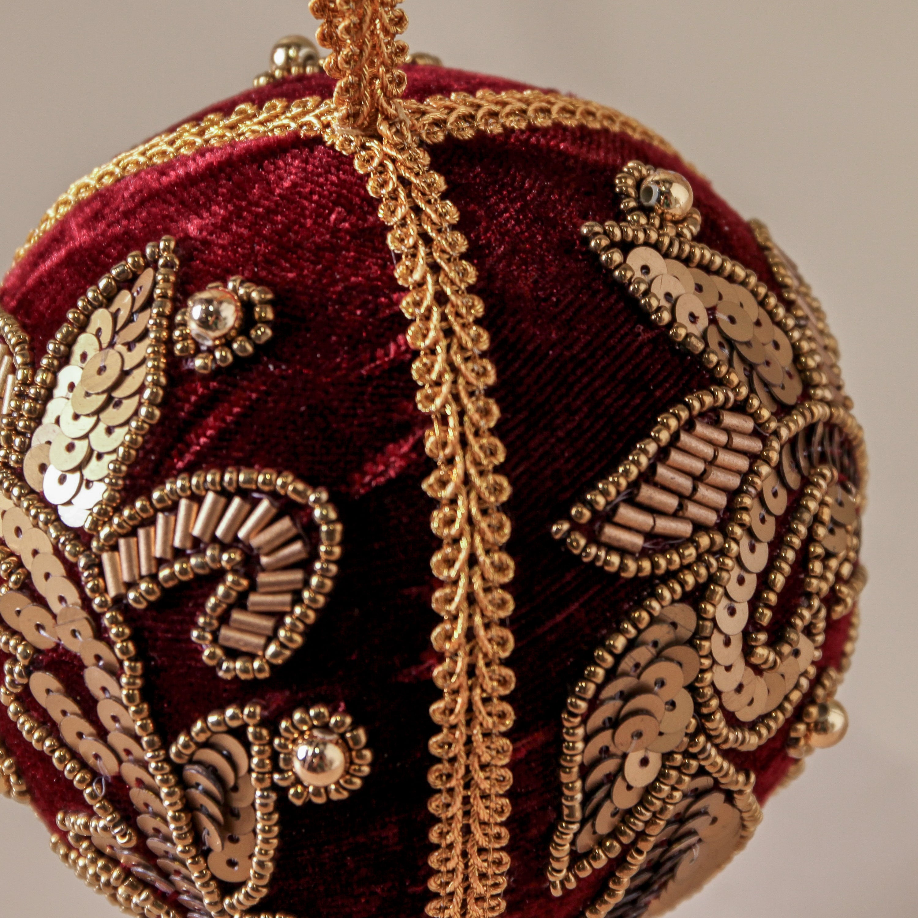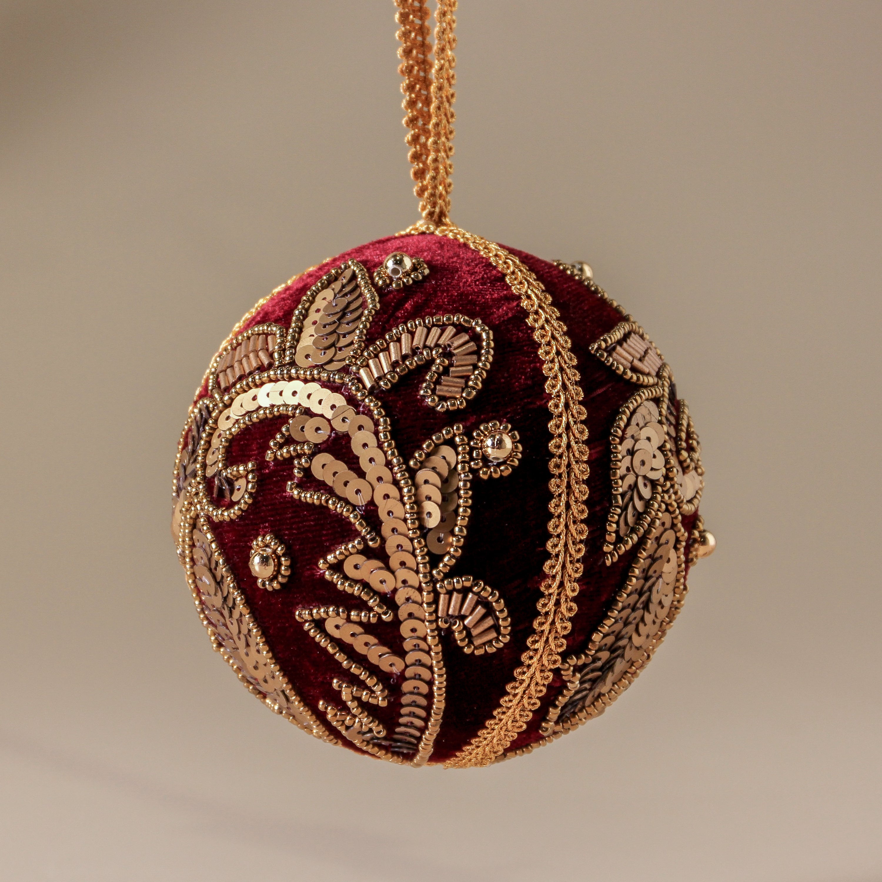With its rich burgundy velvet and intricate gold embroidery, the Cranberry Christmas Bauble offers a deep, indulgent take on traditional holiday décor. The jewel-toned base brings a sense of warmth and intimacy, while delicate hand-applied sequins and beads catch the light in all the right ways. Opulent yet grounded, this bauble adds depth and storytelling to your Christmas styling — perfect for those who embrace the richness of festive tradition with a curated, elevated touch.