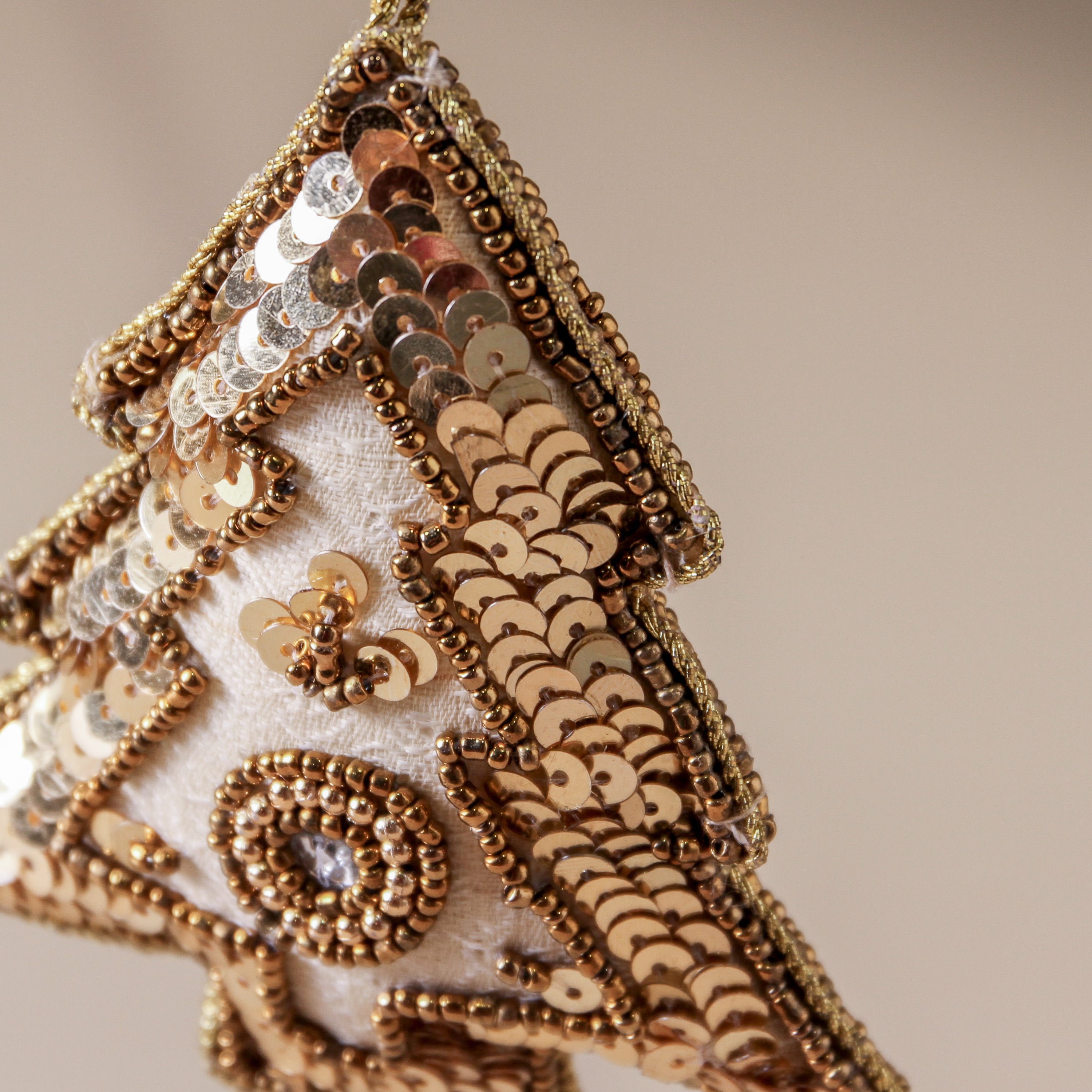 A celebration of the season’s most iconic silhouette, the Fir Christmas Decoration brings a forest’s worth of charm in a single piece. Crafted from deep green velvet and detailed with golden sequins and beads, it balances simplicity with sparkle. A tree upon the tree — layered, handmade, and filled with festive joy.