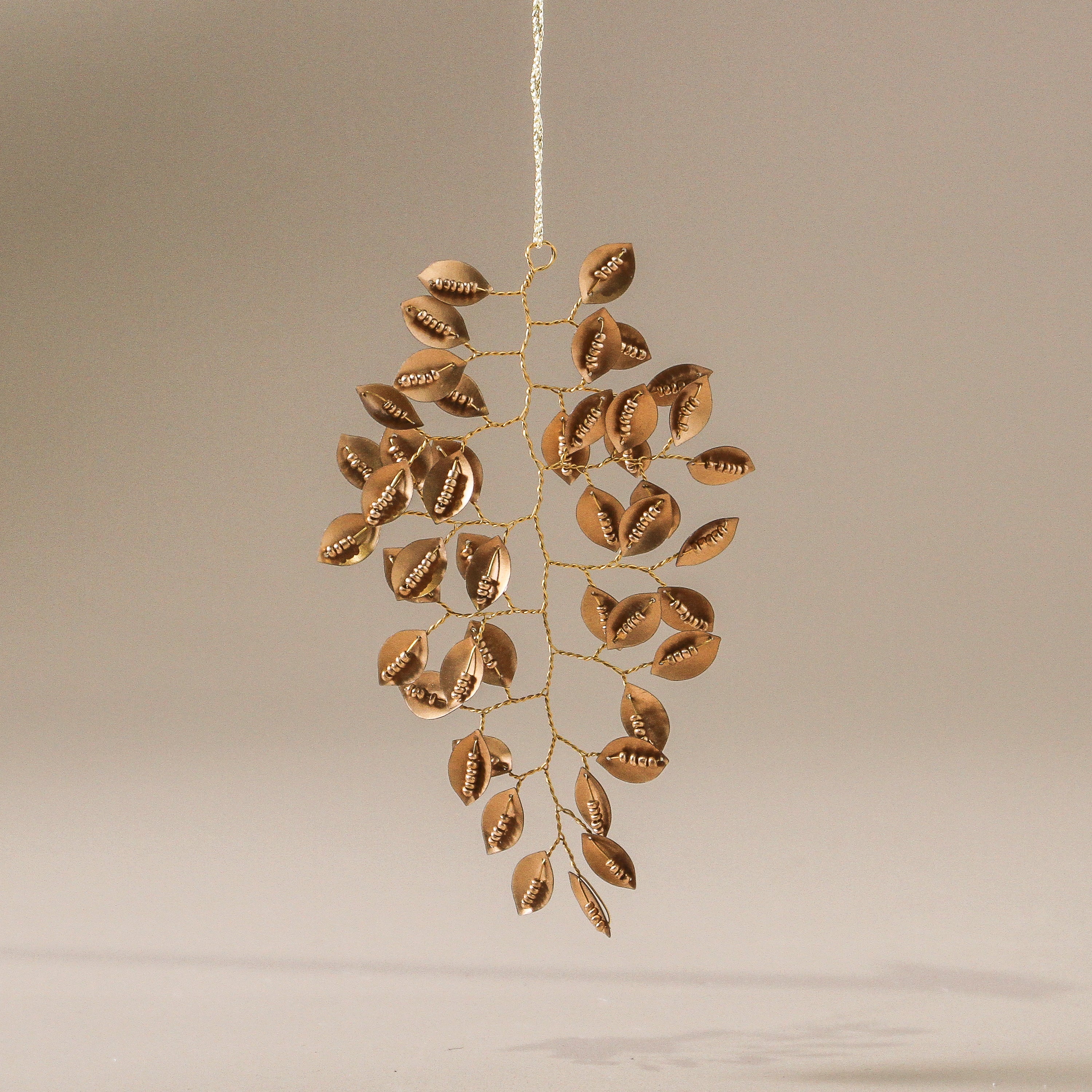 The Flora Sequinned Decoration evokes a golden branch gathered at dawn — delicate, organic, and glistening with dewdrops of beads. Each tiny leaf is hand-formed from golden metal, their surfaces dappled with beads that catch the light with every movement. It’s a miniature foliage piece that brings texture, light, and a whisper of the natural world to your tree.