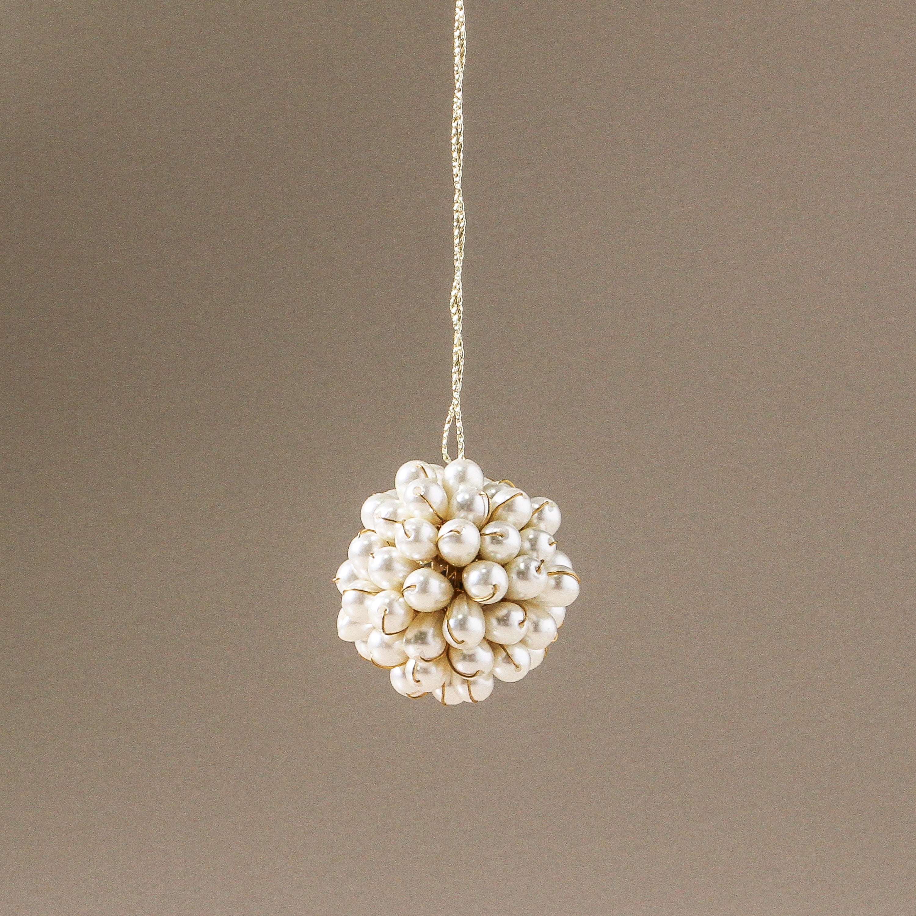 Formed entirely from clusters of soft pearl-like beads, the Galaxy Beaded Decoration is gentle, round, and luminous. It floats like a pale planet — subtle, sculptural, and endlessly refined. This ornament brings an otherworldly grace to any tree, like a bead from a vintage necklace given new life in festive form.