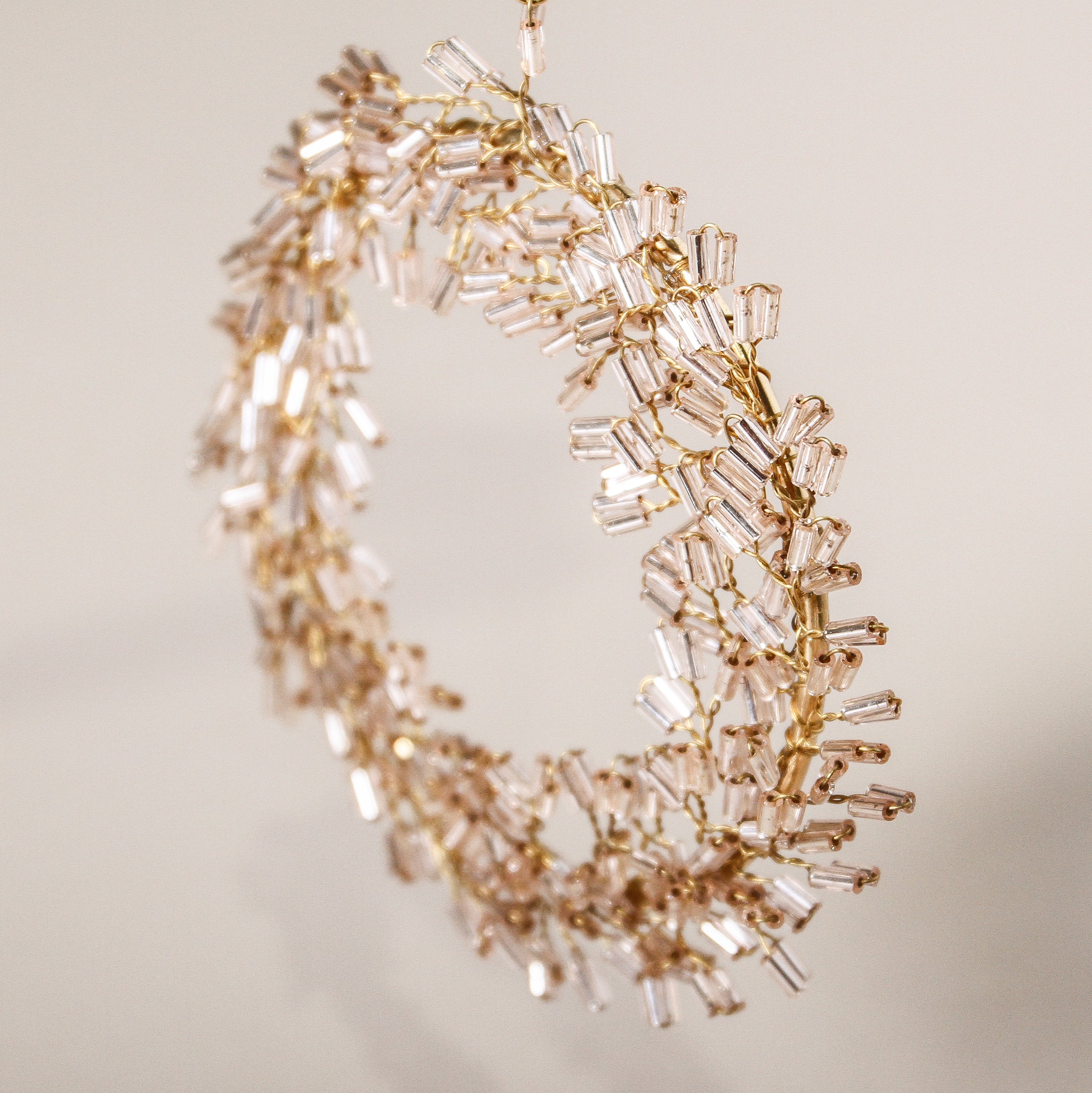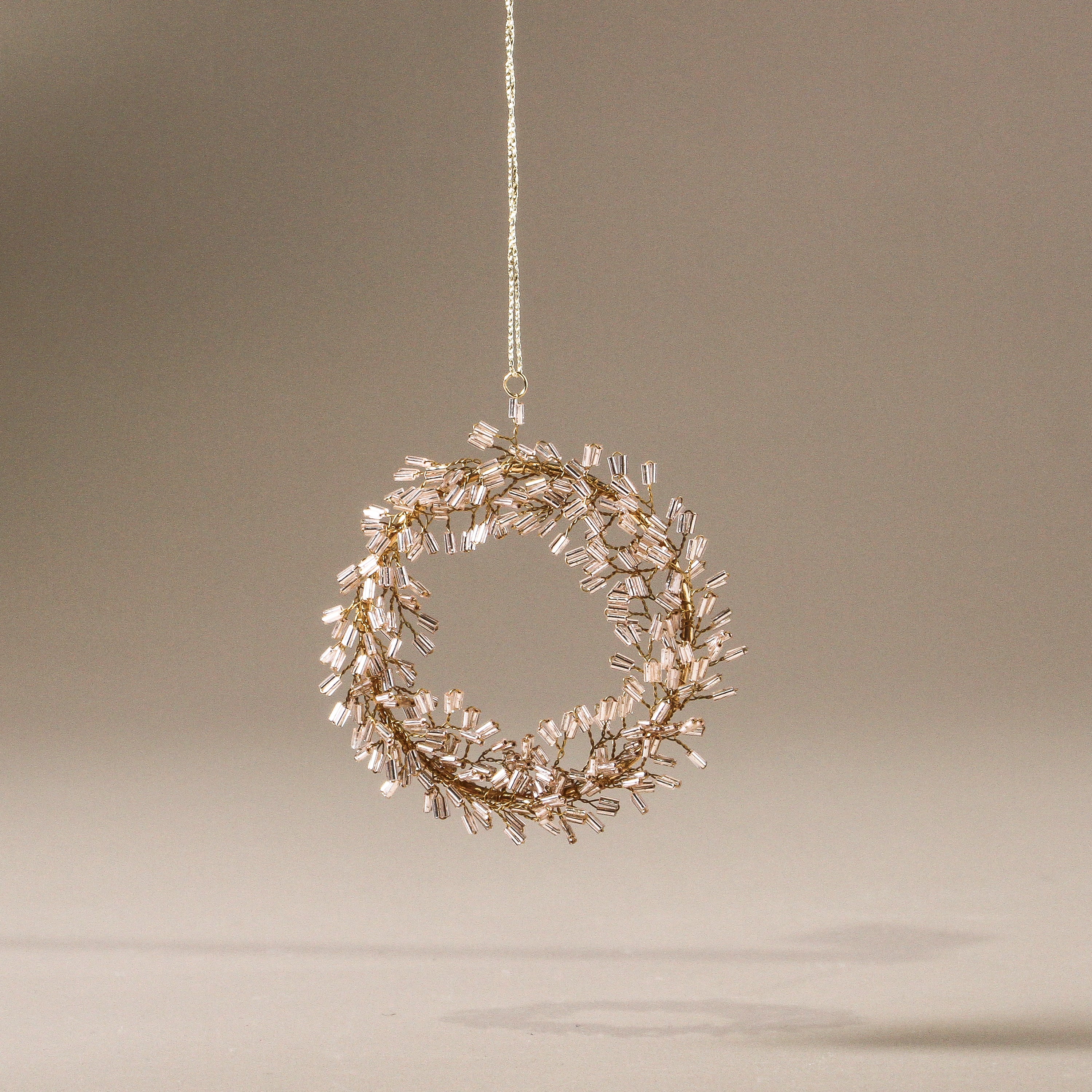 Like a miniature wreath woven from light, the Halo Beaded Decoration feels ethereal and precious. Delicate layers of soft pink beads rest upon a fine golden wire frame, forming a circular design that shimmers with quiet elegance. Suspended from a branch or tree, it feels like antique jewellery — something found, treasured, and meant to be kept.