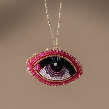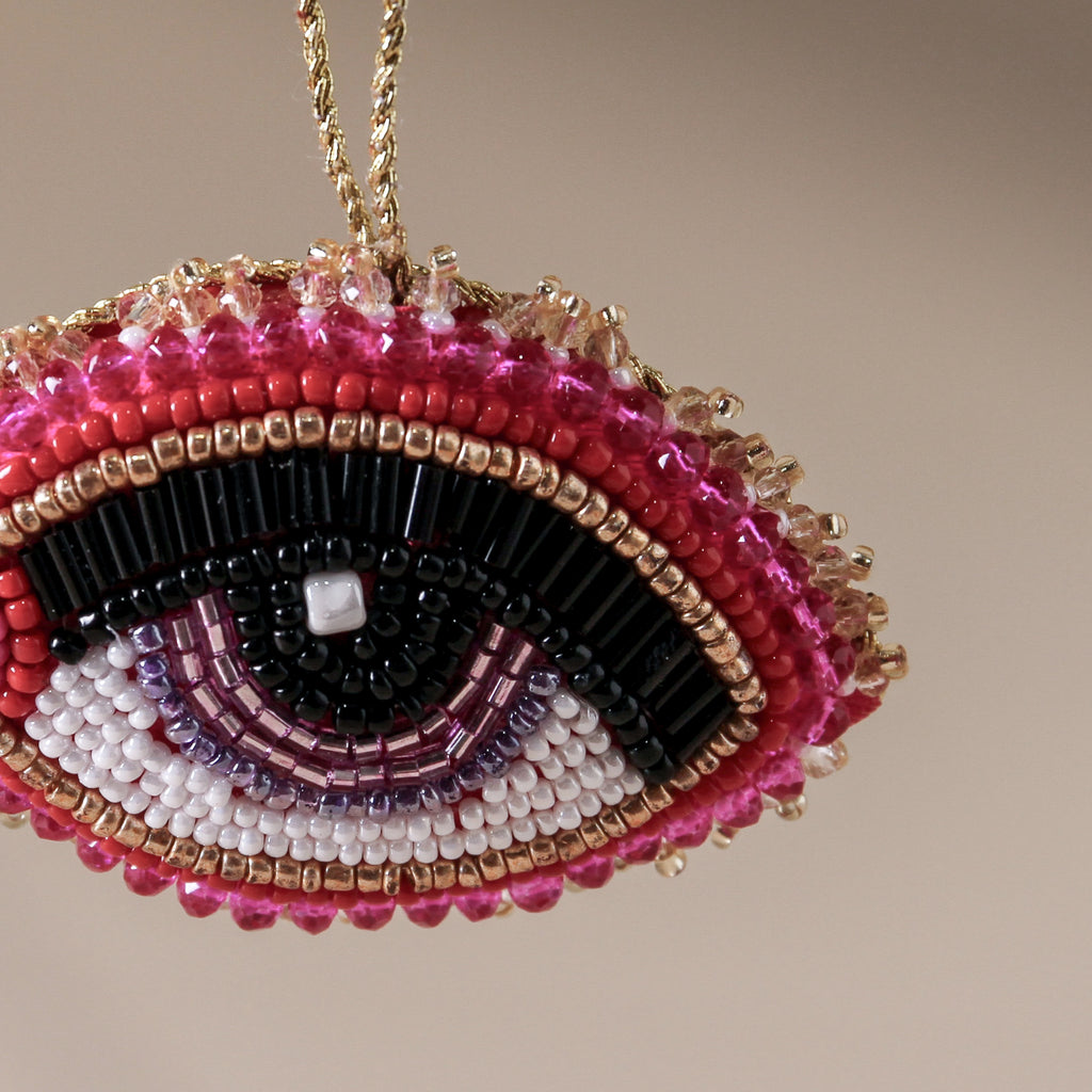 Bold, surreal, and utterly striking, the Prism Beaded Decoration is where art meets ornament. Featuring a stylised embroidered eye in red, white, and black beadwork, it feels at once mystical and modern. With a dreamlike quality drawn from surrealist influences, this ornament is for the creatively minded — a symbol of intuition, reflection, and wonder beneath the branches.