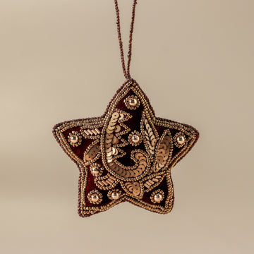 Shaped like a five-pointed star and rich in golden detail, the Stardust Christmas Decoration glows against its deep burgundy velvet backdrop. Each sequin and bead is placed by hand, radiating warmth and elegance. A classic symbol reimagined with quiet drama, it offers a celestial anchor among the branches.