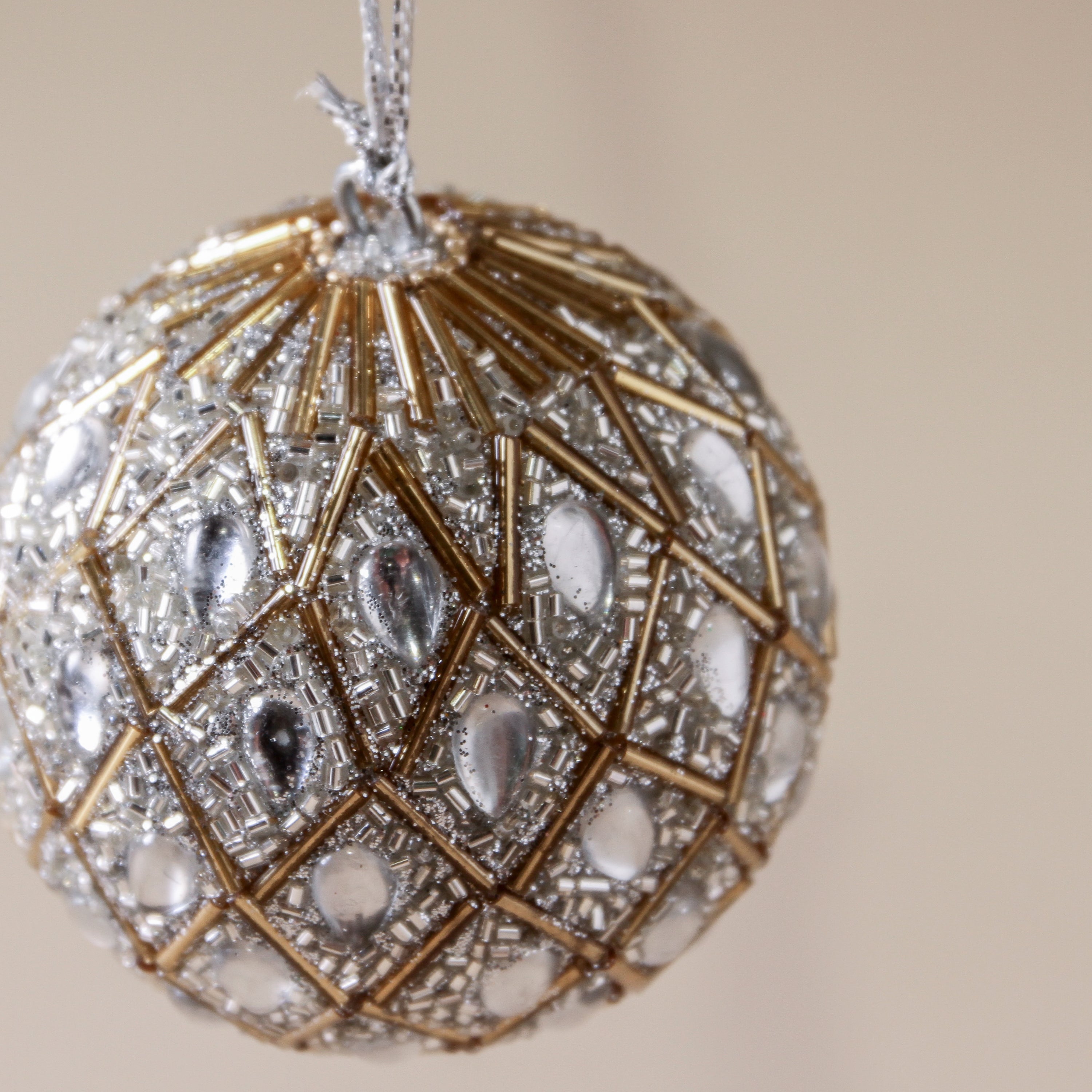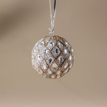 The Starlight Christmas Bauble captures the quiet poetry of winter evenings — soft silver tones, shimmering beads, and glass-like embellishments that glisten like starlight on snow. Hand-embroidered with refined precision, its surface sparkles with subtle elegance, while faceted adornments mimic the clarity of crystal. A dreamy addition to your Christmas tree, it offers a cool counterpoint to warmer festive tones, inviting a sense of calm and clarity to your seasonal styling.