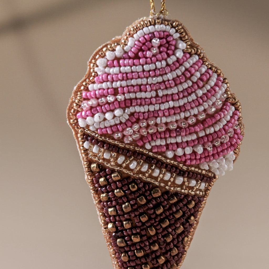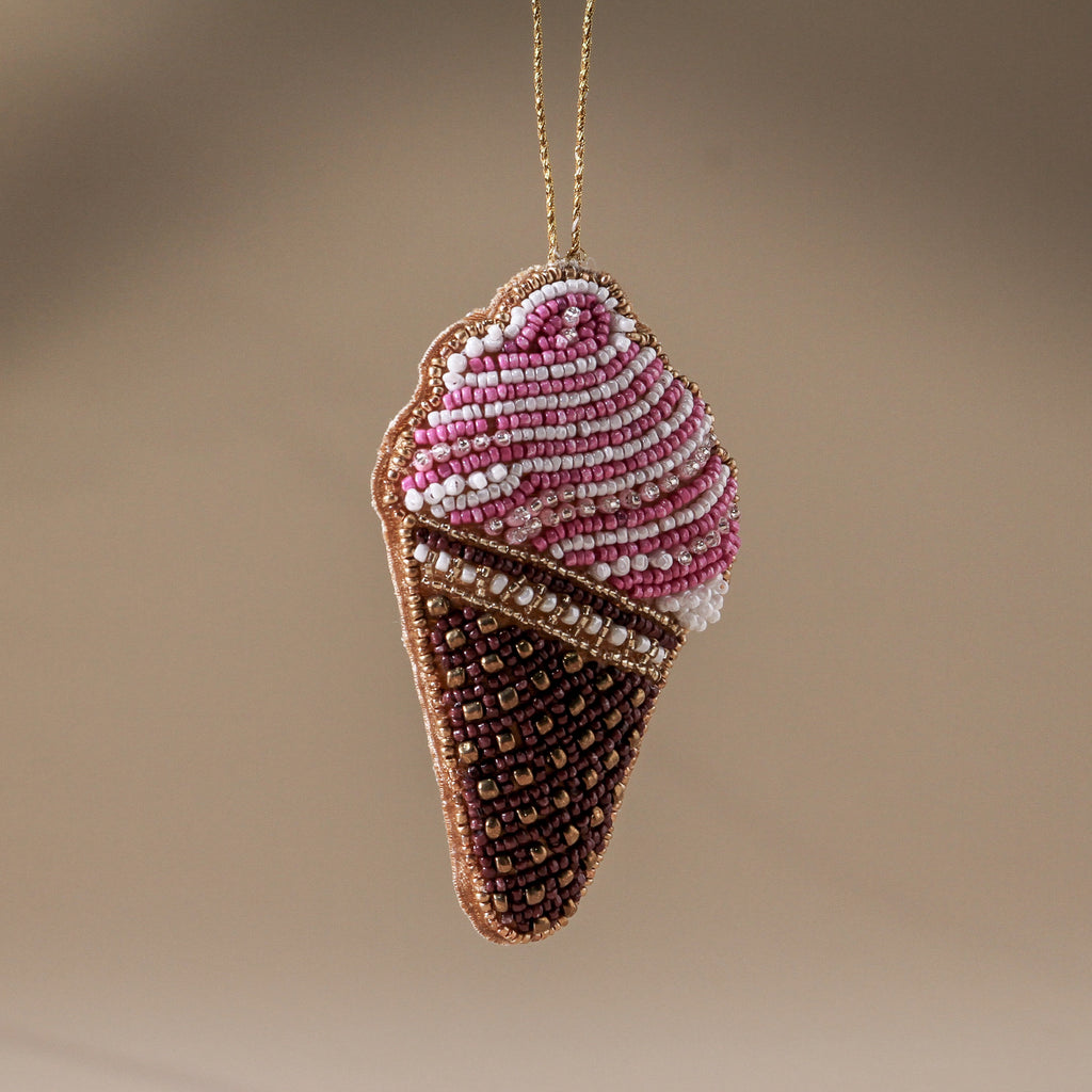 Swirled in soft pinks and finished with a glittering waffle cone, the Sundae Beaded Decoration is a joyful wink to sweet summer moments. With its colourful surface and delicately applied beadwork, it’s a playful piece that blends nostalgia with indulgence. Light, lovely, and handcrafted with flair, it adds a scoop of delight to any festive styling.