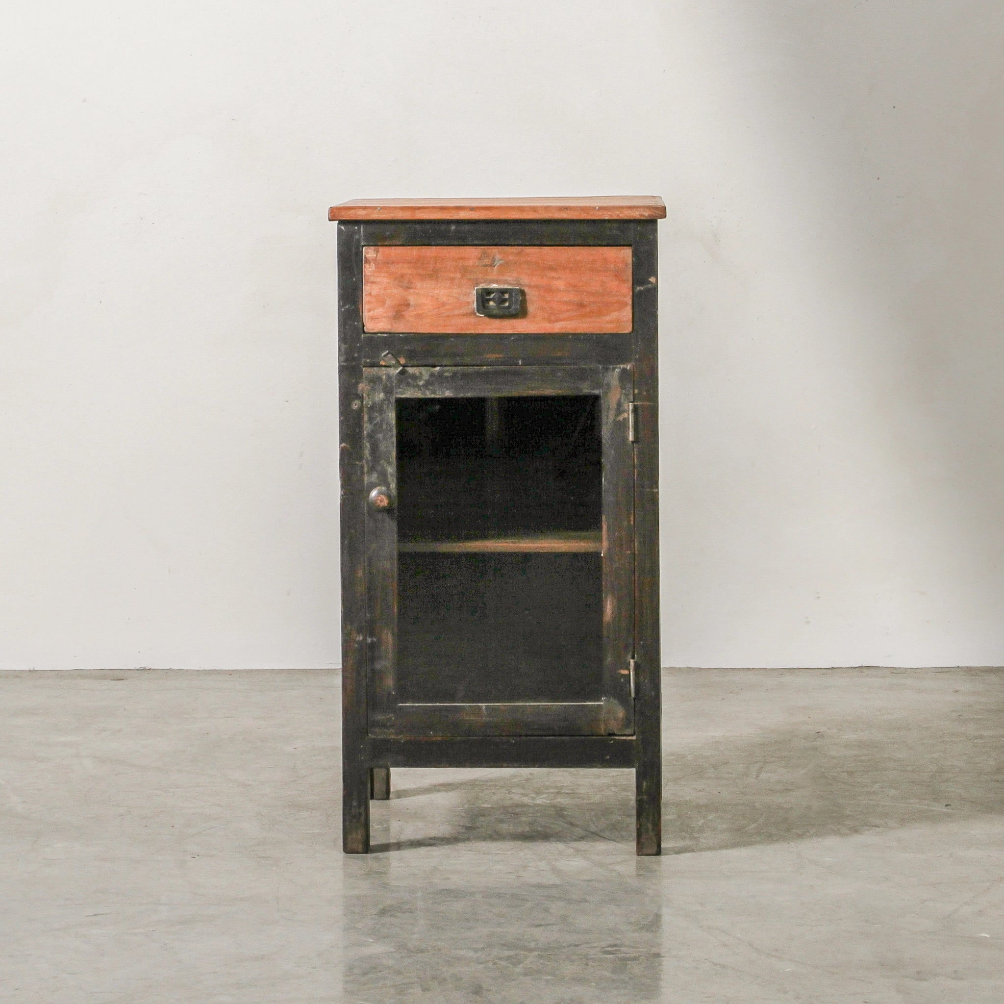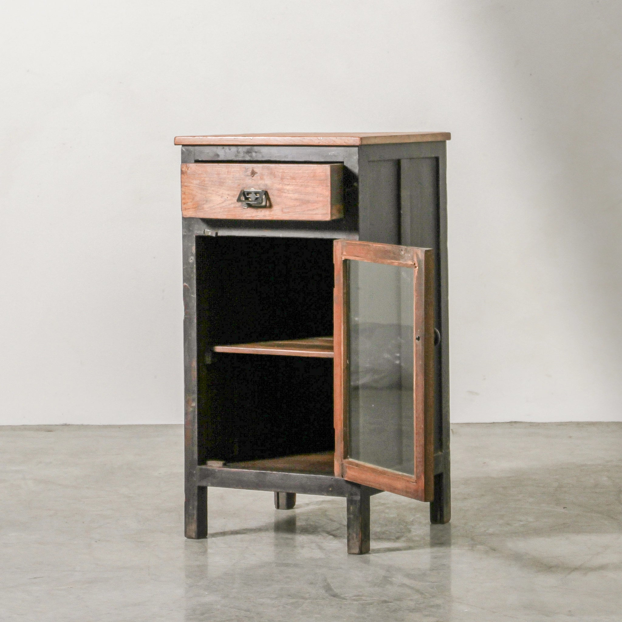Infused with warmth and tradition, this vintage Indian almirah is crafted from solid teak with a wax finish that enhances its aged surface. Featuring a glass-fronted door and a practical drawer, it carries 60–80 years of Rajasthani heritage while offering compact, functional storage. Perfect as a bedside companion or accent cabinet, it blends everyday utility with cultural character.