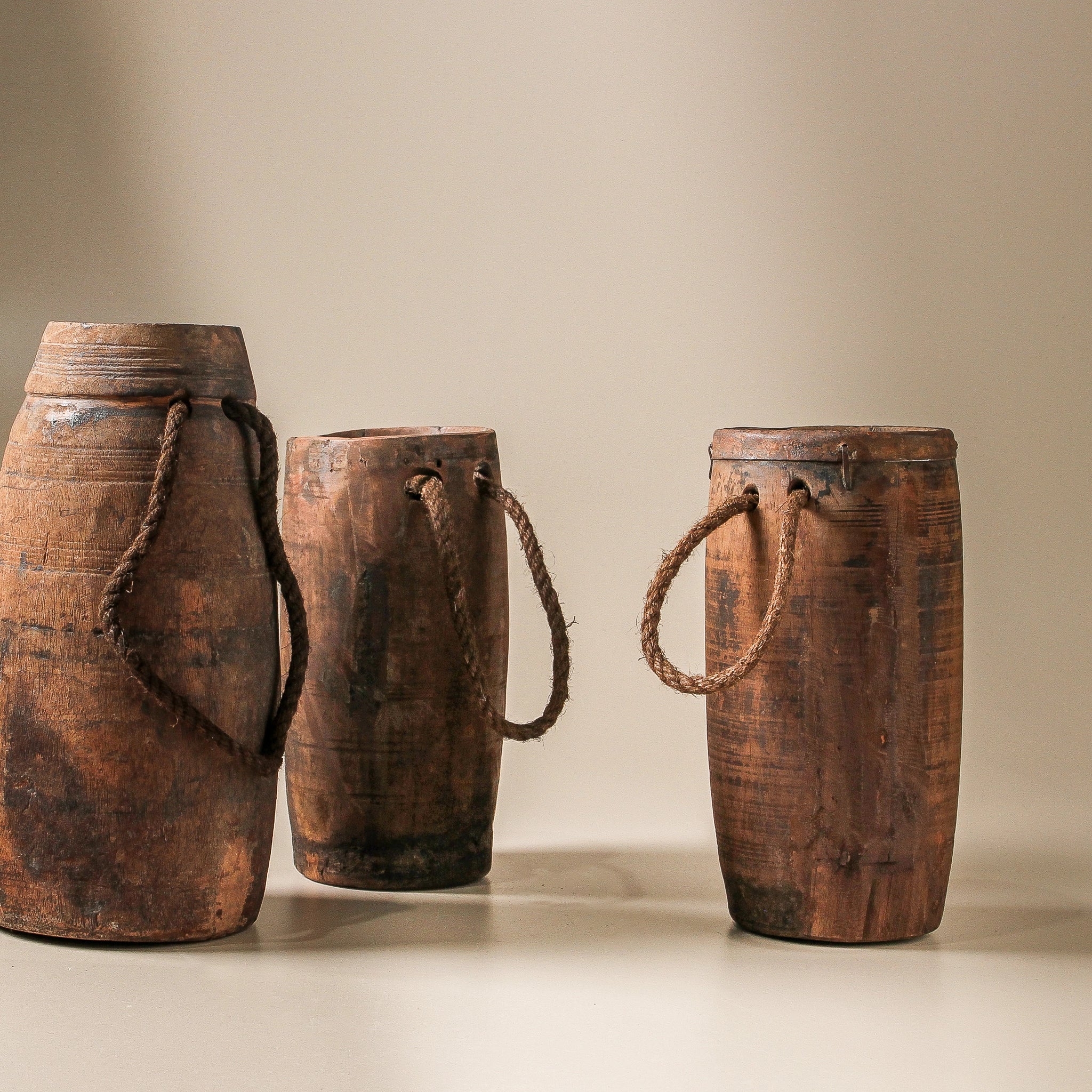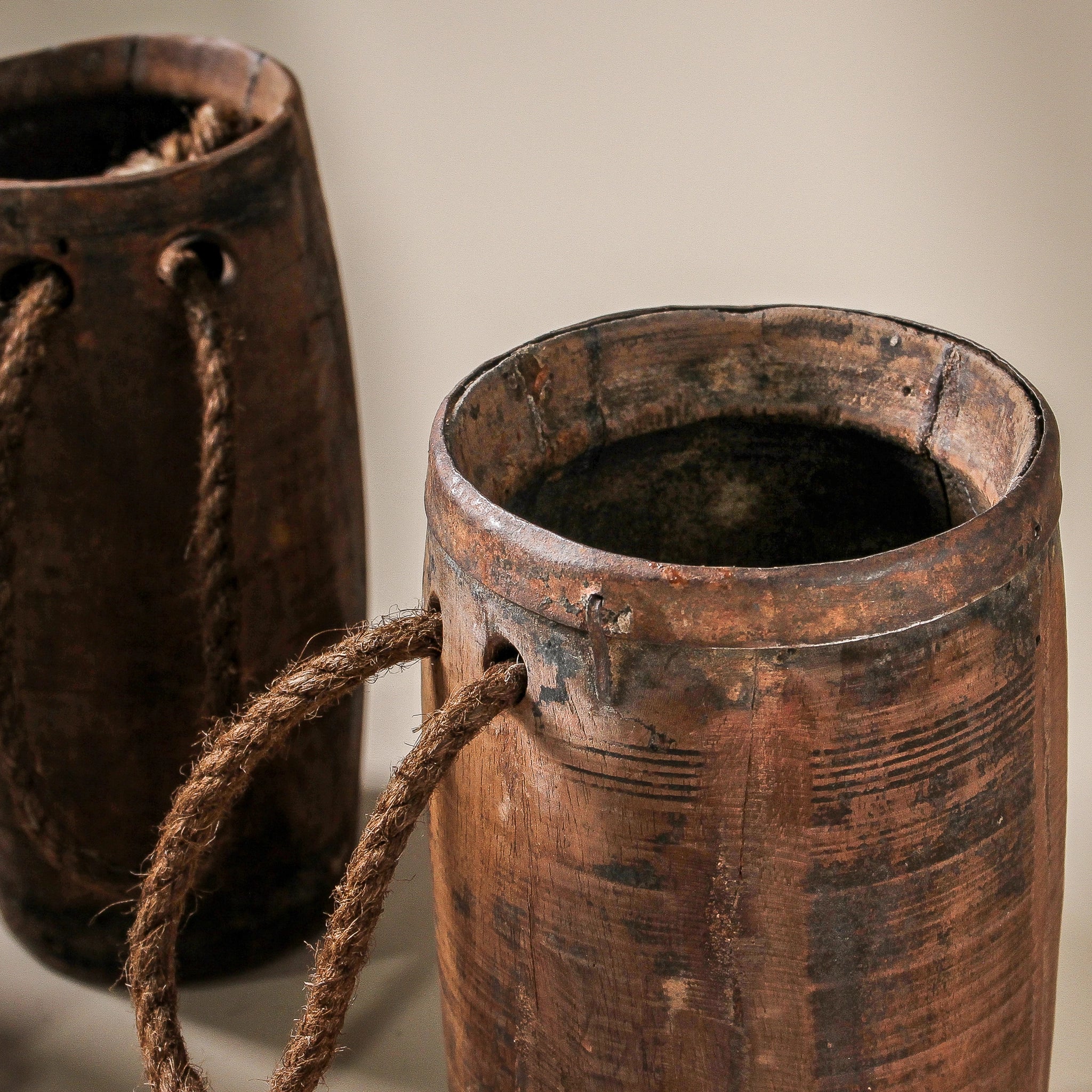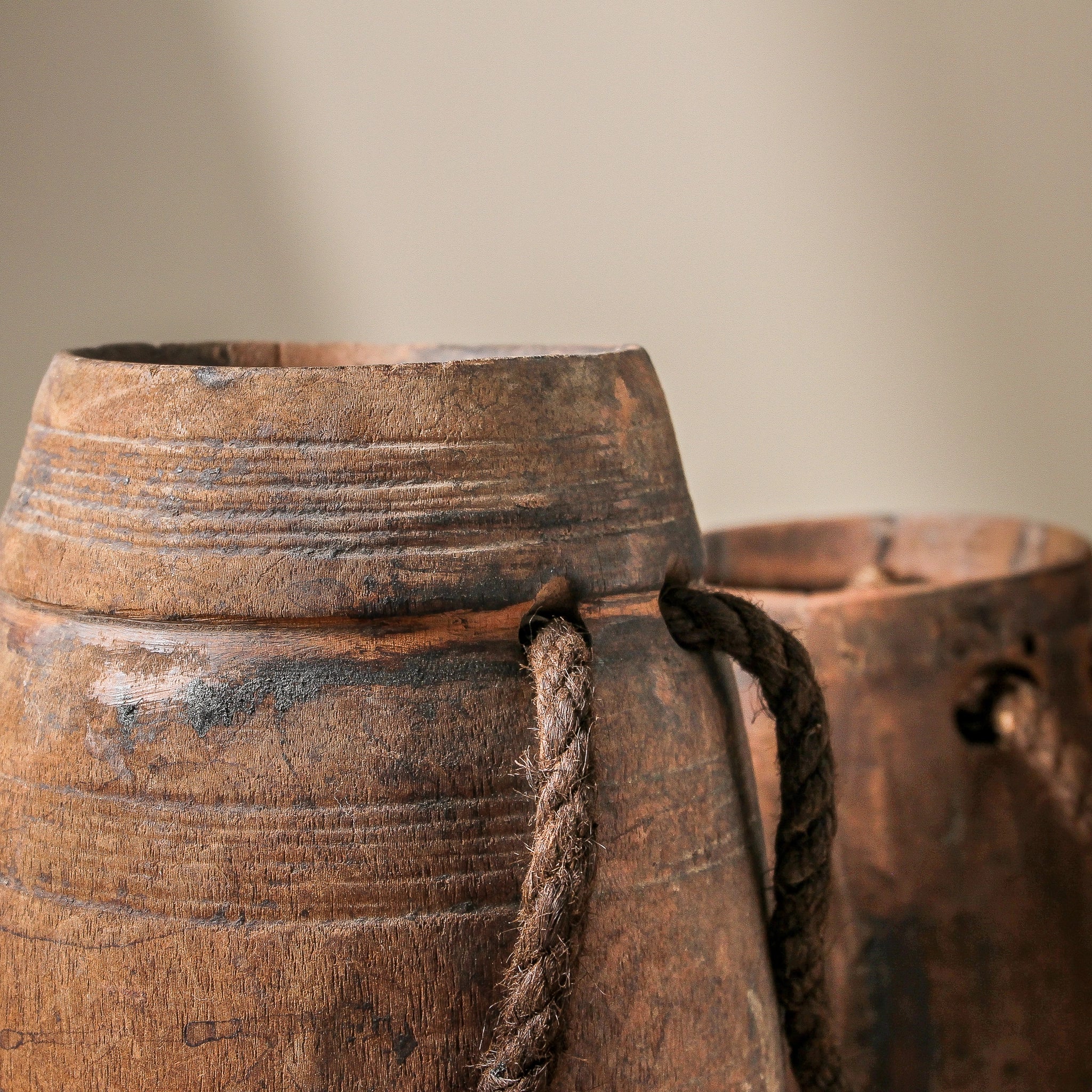 Echoing a history of artisanship, this vintage Indian pot is hand-carved from solid teak and finished with a natural wax that enhances its aged patina. Once used in Rajasthani kitchens 60–80 years ago, its tall, narrow form now makes it a sculptural accent — perfect for styling on shelves, tables, or consoles. Its timeworn surface and original character bring warmth and authenticity to any space.