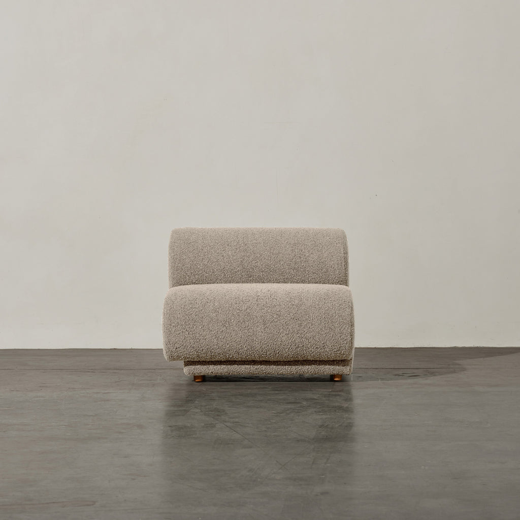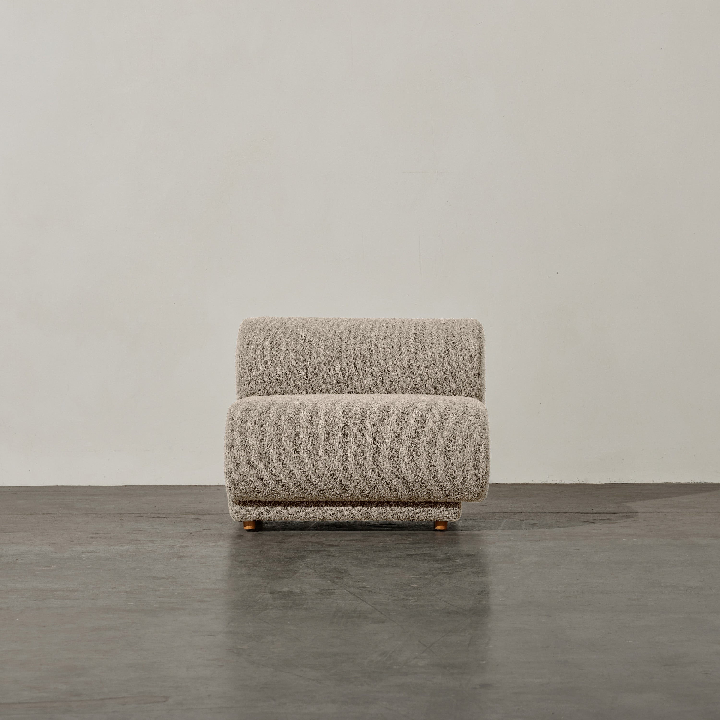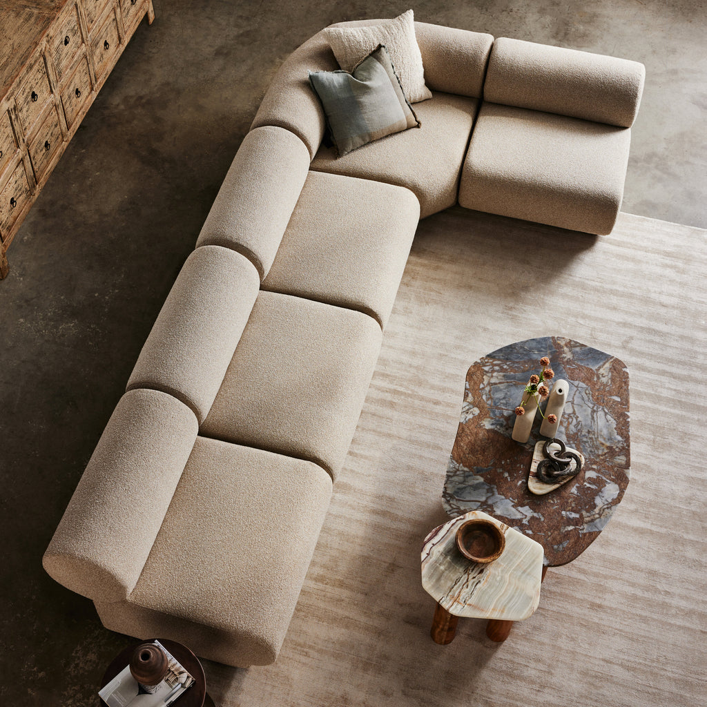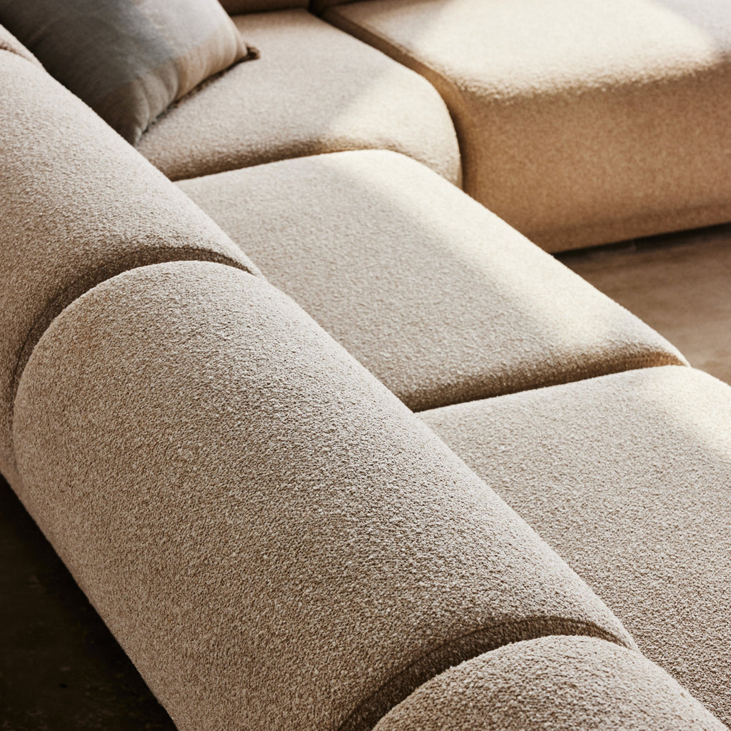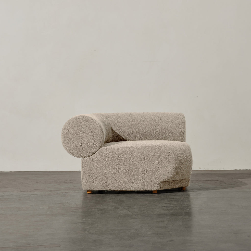 The Roland Modular Sofa is the ultimate entertainer's sofa, designed to elevate your living space with its unique features and versatility. The curvaceous form and stylised silhouette of the Roland Modular Sofa, with its rounded tube-like back, make it a true statement piece. It's modern design combines comfort and style, ensuring a seating experience that is both visually appealing and comfortable. Available in two colourways - green and beige - the Roland Modular Sofa allows you to choose the perfect hue to complement your space. The premium upholstery in a boucle-style fabric not only enhances its visual appeal but also offers a luxurious and comfortable seating experience. The Roland Modular Sofa is comprised of modular pieces, allowing you to configure it in any way you desire to suit your living room. Mix and match the right, middle, left, and corner pieces to create a customised arrangement that perfectly suits your room layout and seating needs. For those with a large living room space, creating a curved corner shaped sofa is perfect for maximising entertaining space and also exudes a distinct 70s feel, adding a touch of retro charm to your room. In a small apartment living space, you may opt for 2-3 pieces to create a 2-3 seater sofa arrangement.