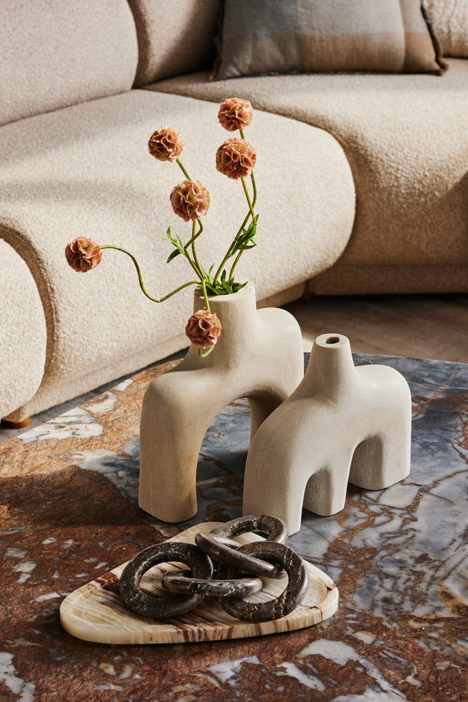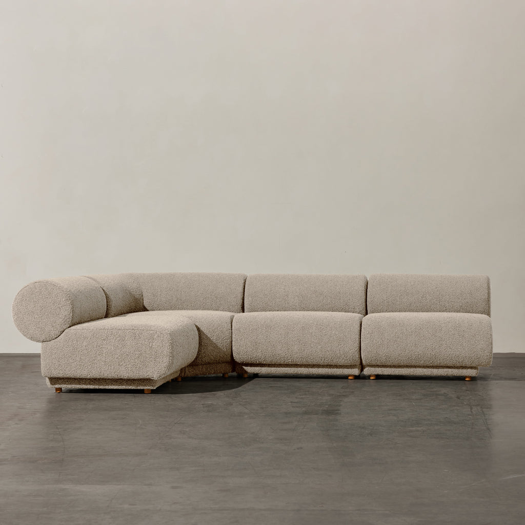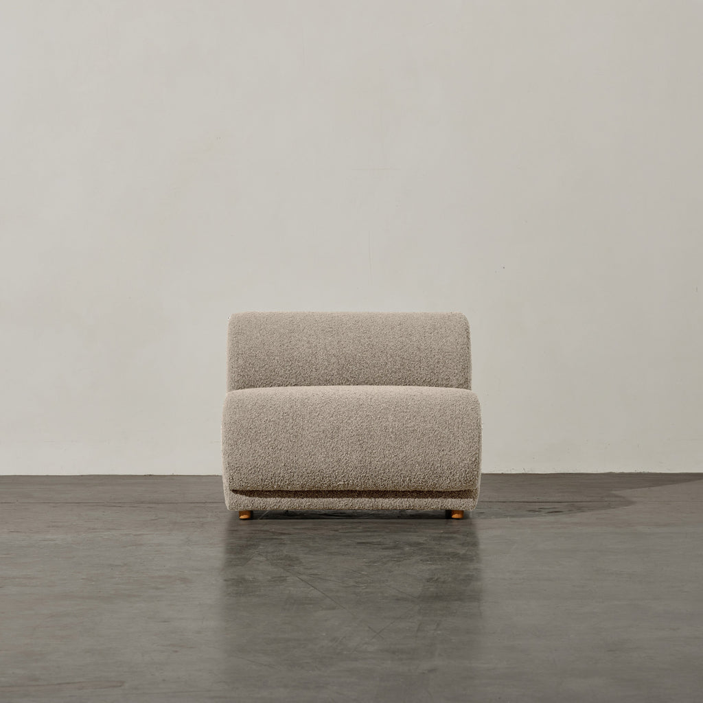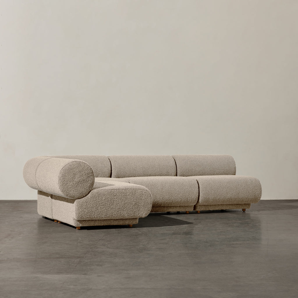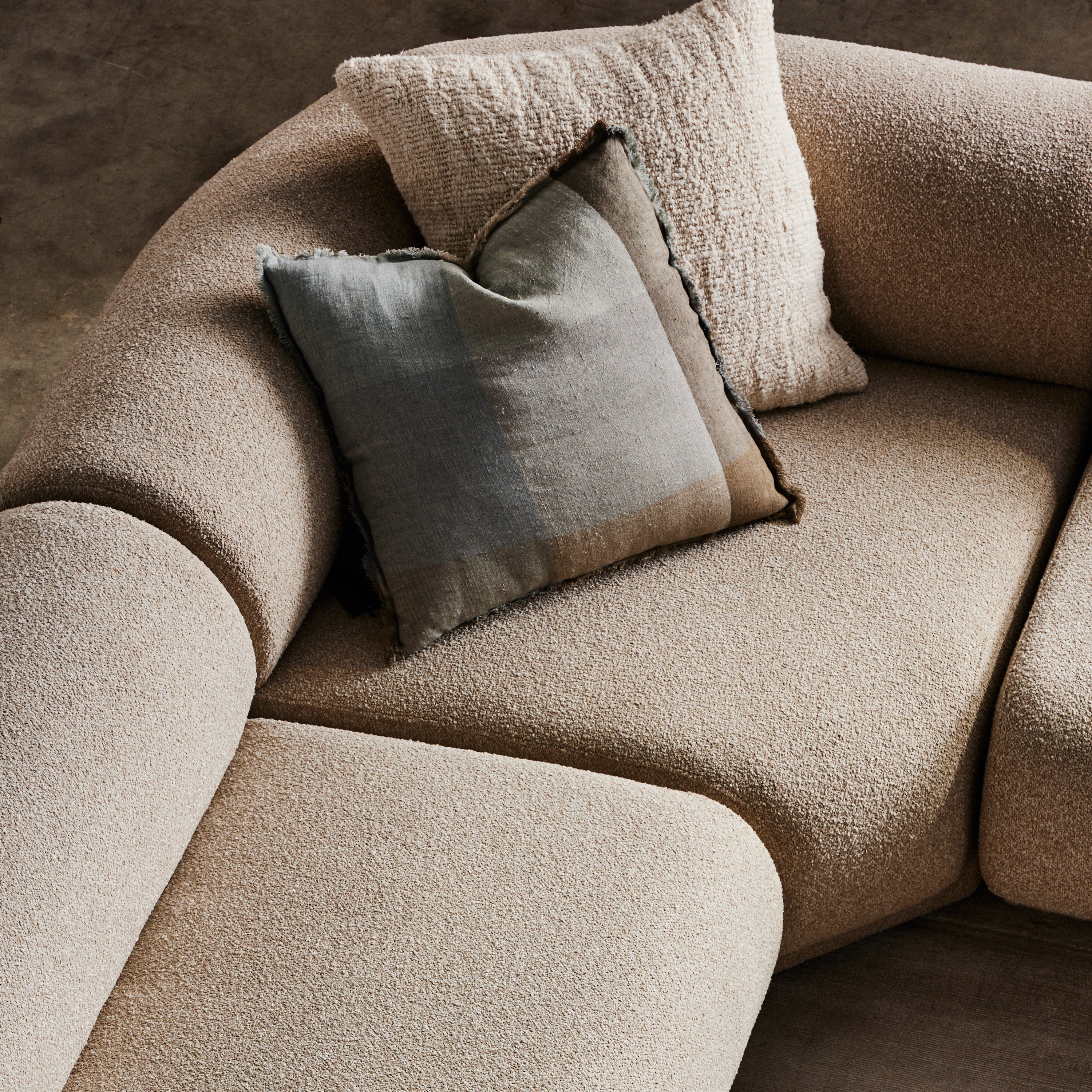 The Roland Modular Sofa is the ultimate entertainer's sofa, designed to elevate your living space with its unique features and versatility. The curvaceous form and stylised silhouette of the Roland Modular Sofa, with its rounded tube-like back, make it a true statement piece. It's modern design combines comfort and style, ensuring a seating experience that is both visually appealing and comfortable. Available in two colourways - green and beige - the Roland Modular Sofa allows you to choose the perfect hue to complement your space. The premium upholstery in a boucle-style fabric not only enhances its visual appeal but also offers a luxurious and comfortable seating experience. The Roland Modular Sofa is comprised of modular pieces, allowing you to configure it in any way you desire to suit your living room. Mix and match the right, middle, left, and corner pieces to create a customised arrangement that perfectly suits your room layout and seating needs. For those with a large living room space, creating a curved corner shaped sofa is perfect for maximising entertaining space and also exudes a distinct 70s feel, adding a touch of retro charm to your room. In a small apartment living space, you may opt for 2-3 pieces to create a 2-3 seater sofa arrangement.