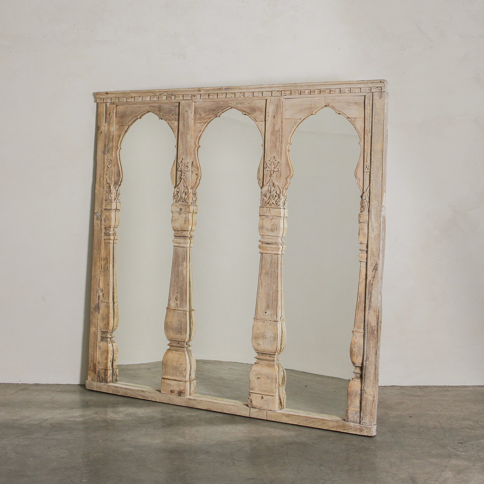 Designed to bring depth and story to your home, this vintage Indian arched mirror is framed from an old architectural arch, handcrafted in solid teak and finished in a soft bleached tone. Carrying 60–80 years of history from Rajasthan, it transforms a piece of heritage into a striking statement mirror. Monumental in scale, it can anchor a room, reflect light beautifully, and introduce sculptural presence to contemporary interiors.